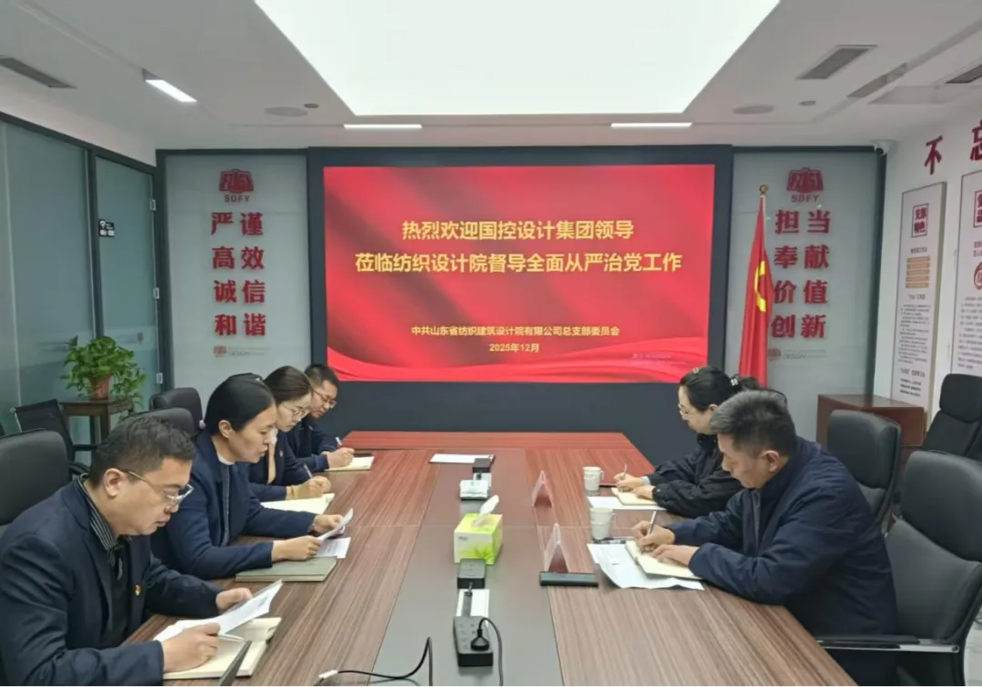 12月4日,山東省國控設(shè)計集團有限公司黨委副書記、董事、總經(jīng)理王風(fēng)光一行到紡織設(shè)計院開展落實全面從嚴(yán)治黨主體責(zé)任情況督導(dǎo)調(diào)研,并全程列席指導(dǎo)紡織設(shè)計院黨總支會議。